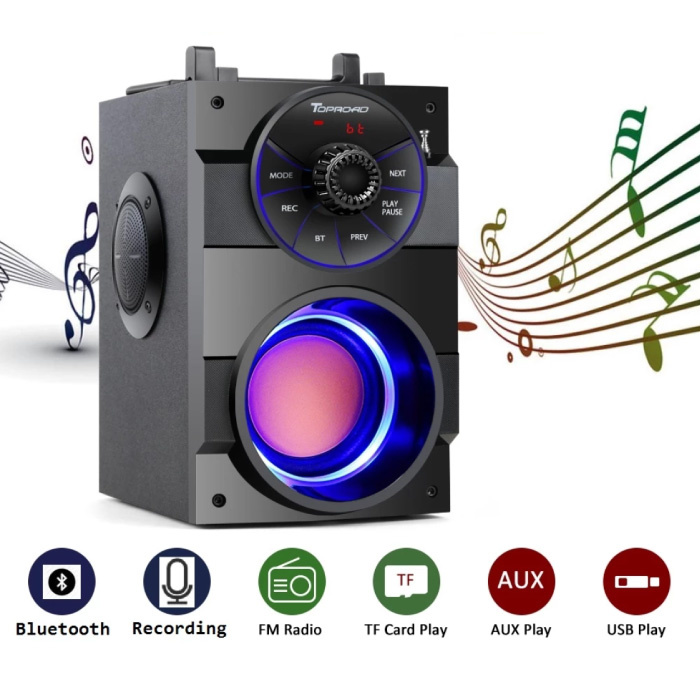 Dank der Batterietechnologie von TOPROAD können Sie eine besonders lange Spielzeit von bis zu 6 Stunden genießen. Der Lautsprecher kann jedoch auch über ein Kabel angeschlossen werden.