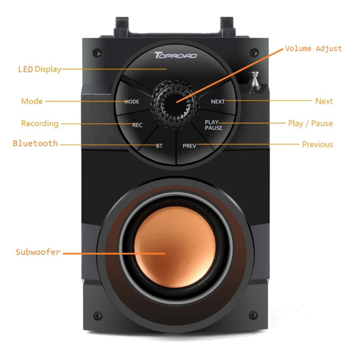 | Paket enthält: | 1x TOPROAD A100 Lautsprecher 1x Ladekabel 1x AUX-Kabel 1x Fernbedienung 1x Handbuch |