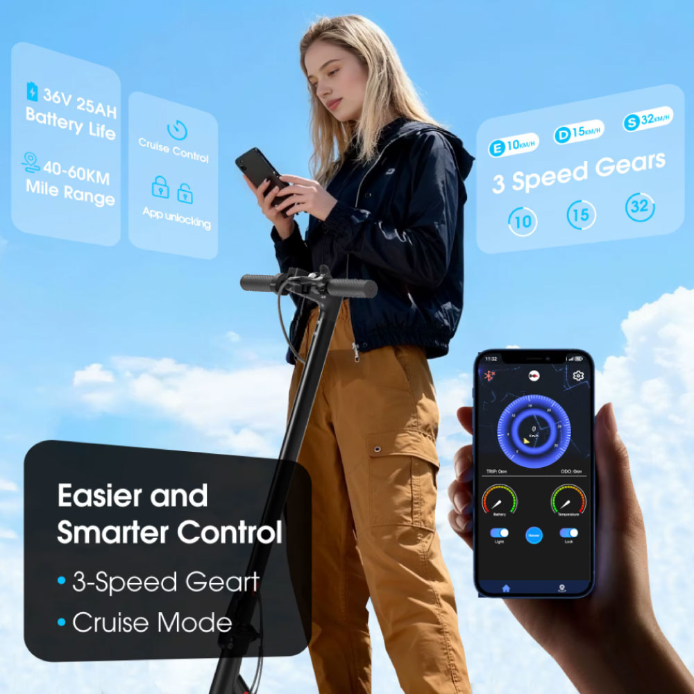 Mit seinem leistungsstarken 36V 25Ah-Akku bietet dieser Scooter eine beeindruckende Reichweite von 60 bis 70 km und ermöglicht so lange Fahrten ohne Aufladen. Der robuste Aluminiumrahmen bietet ein optimales Verhältnis von Langlebigkeit und Gewicht, und dank des faltbaren Designs lässt er sich leicht transportieren und verstauen.