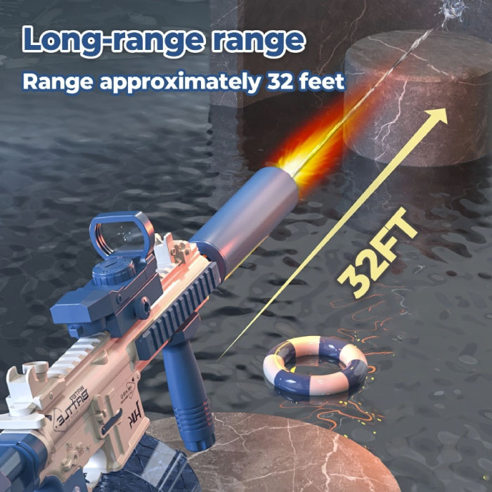 Mit der Wasserpistole M4 können Sie dank der sicher in einem wasserdichten Fach untergebrachten Batterie vollautomatisch schießen. Diese Wasserpistole ist so konzipiert, dass sie alle Ihre Anforderungen erfüllt. Halten Sie den Abzug gedrückt und schießen Sie ohne Unterbrechung und ohne Leckage weiter.