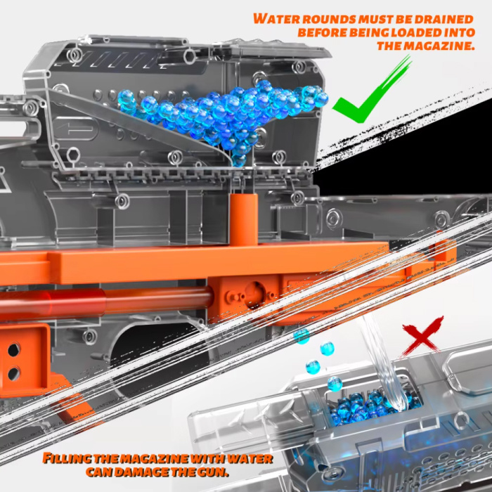 Hinweis: Stellen Sie sicher, dass überschüssiges Wasser aus den Bällen abgelassen wird, bevor Sie sie in den Gel-Blaster laden. Dadurch wird verhindert, dass Wasser in den Blaster eindringt.