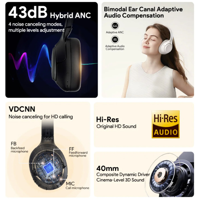 Aktive Geräuschunterdrückung (ANC) von 43 dB mit Transparenzmodus