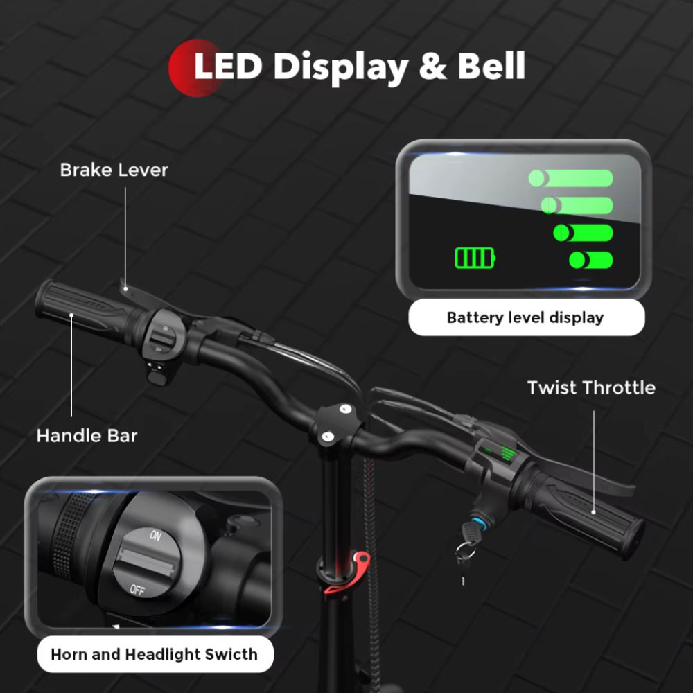 Für maximale Sicherheit ist der iScooter i12 mit einem fortschrittlichen Dual-Bremssystem ausgestattet. Die Kombination aus einer verdeckten elektronischen Bremse mit Energierückgewinnung und Scheibenbremsen vorne und hinten sorgt für kraftvolles und stabiles Bremsen. Dadurch ergibt sich ein kurzer Bremsweg (ca. 4–5 Meter) , was die Kontrolle während der Fahrt verbessert.