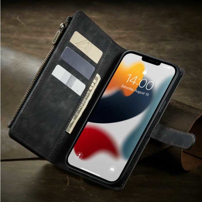 Das Lederetui vereint Portemonnaie und Smartphone in einem Etui; Es gibt zwei Fächer mit Platz für Kreditkarten und Bargeld, ein transparentes Fach für Ihren Personalausweis und ein Reißverschlussfach für Ihre Münzen.