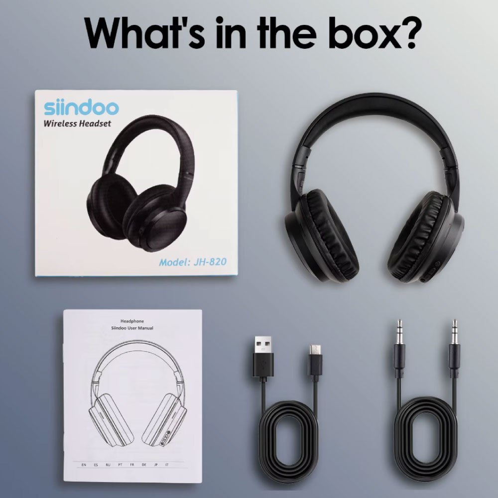 | Das Paket beinhaltet: | 1x Siindoo JH-820 Kabellose Kopfhörer 1x Ladekabel 1x AUX-Kabel 1x Handbuch |