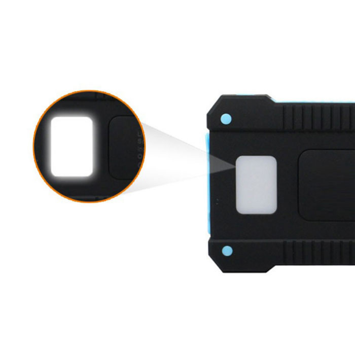 Das Solarladegerät verfügt über zwei USB-Eingänge, sodass Sie zwei Geräte gleichzeitig aufladen können. Zudem verfügt die Powerbank über eine eingebaute Taschenlampe und ist komplett wasserdicht. Ideal für Festivals und Camping!