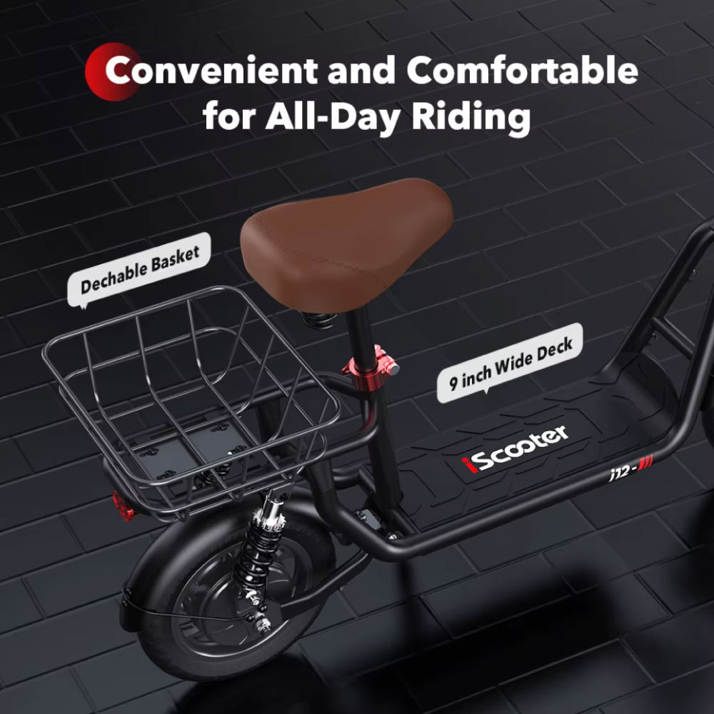 The iScooter i12 Electric Scooter is a powerful and comfortable electric scooter perfect for daily trips, commuting, and longer distances. Thanks to its powerful motor, long range, and stable design, this scooter offers a smooth and safe riding experience. It also folds easily, making it easy to transport or store.