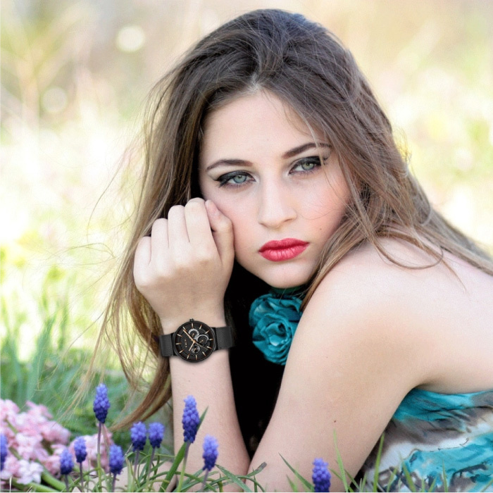 The timepiece features a beautiful woven design for a very stylish look. The watch case is reinforced by a black metal casing. The bracelet is made of a stainless steel mesh.