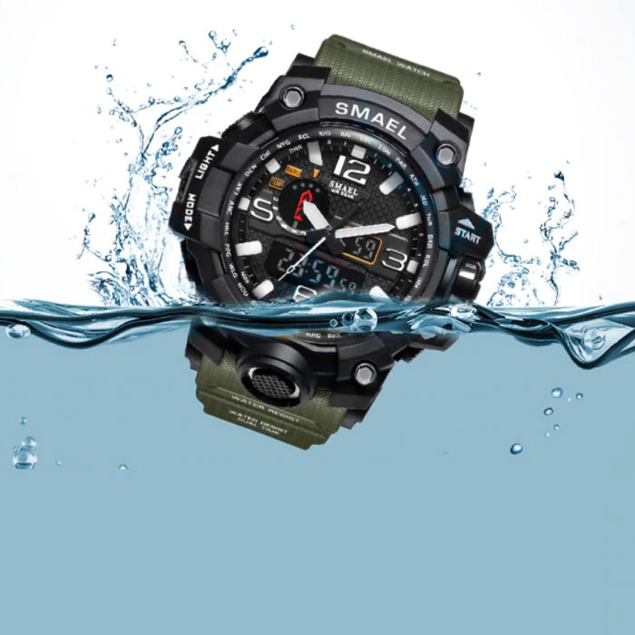 The watch has an analog movement but also a digital display for the time display. The watch also has a subdial that functions as calendars. In addition, it is 5 ATM waterproof, suitable for diving up to 50 meters deep! At night you have no problem reading the hour thanks to the backlighting that you can activate with the button on the side.