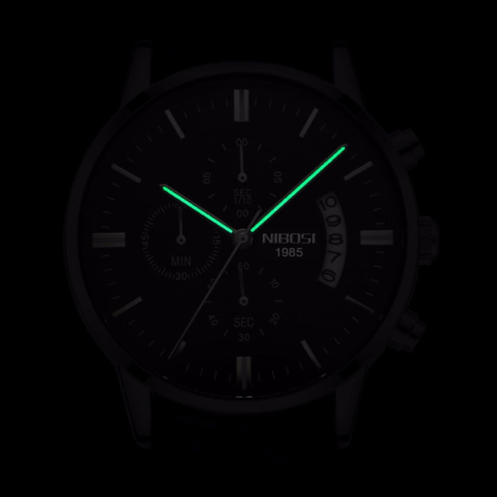 The watch has three sub-dials. The bottom one is a chronograph for seconds, the left subdial for minutes and the top subdial allows you to measure differences of up to 1 / 10ᵉ second. On the right side is a handy calendar for keeping track of the day of the month. In addition, it is 3 ATM waterproof, suitable for daily use.
