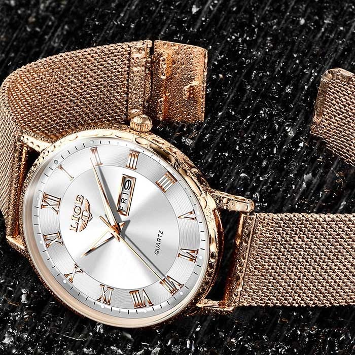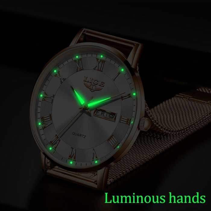 This luxury watch from Lige is made with a stainless steel bracelet. It has a beautiful glossy design with Roman numerals to indicate the hours. Every detail of the watch has been carefully worked out so that the design comes into its own.