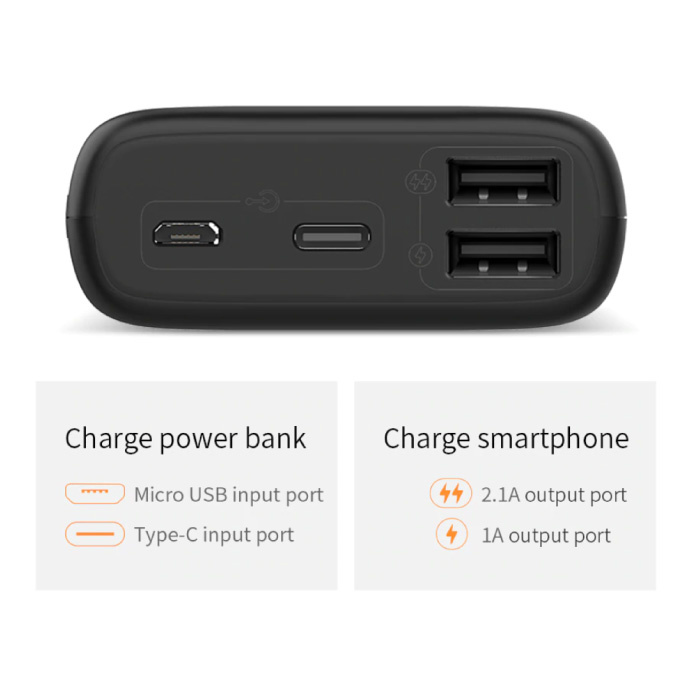 The power bank has two input ports and two output ports. This makes it possible to charge two devices at the same time: one USB port with 2.1A fast charging, and one USB port with 1A.