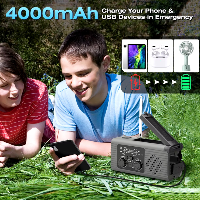 Banco de energía solar de 4000 mAh y radio de emergencia con dinamo - Linterna incorporada - Cargador de batería de emergen