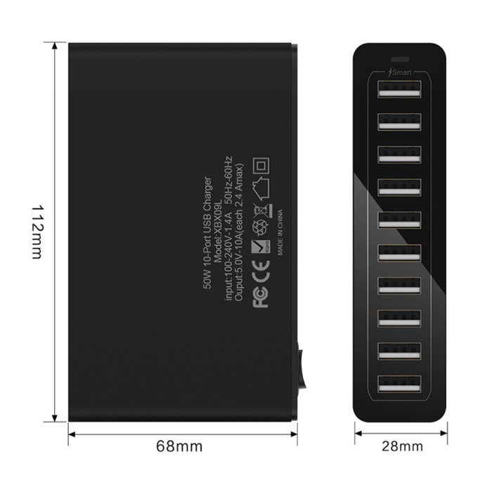Estación de carga USB de 10 puertos Cargador de pared de 50 W Cargador doméstico Adaptador de cargador de enchufe Negro