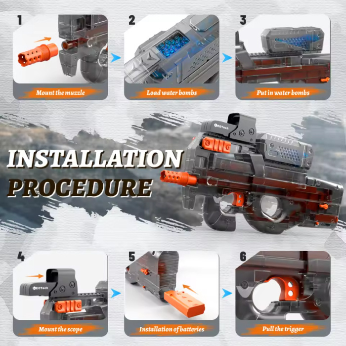 | El paquete incluye: | 1 pistola de gel eléctrica P90 con accesorios 1 cargador USB |