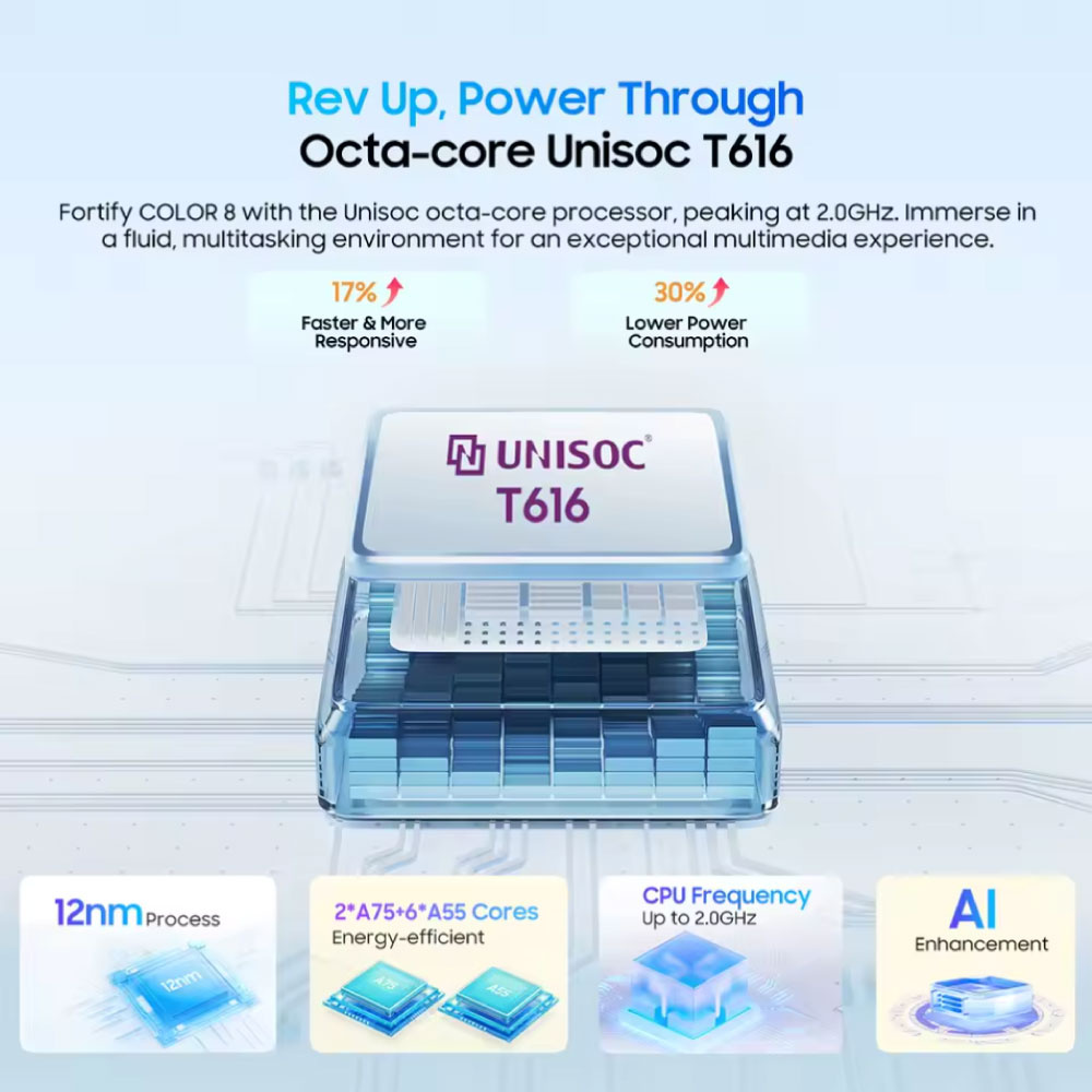 Gracias a su potente batería de 6000 mAh, podrás aguantar fácilmente un día entero, e incluso más, sin necesidad de recargar. El procesador Unisoc T616 de ocho núcleos garantiza un rendimiento estable y eficiente durante el uso diario.