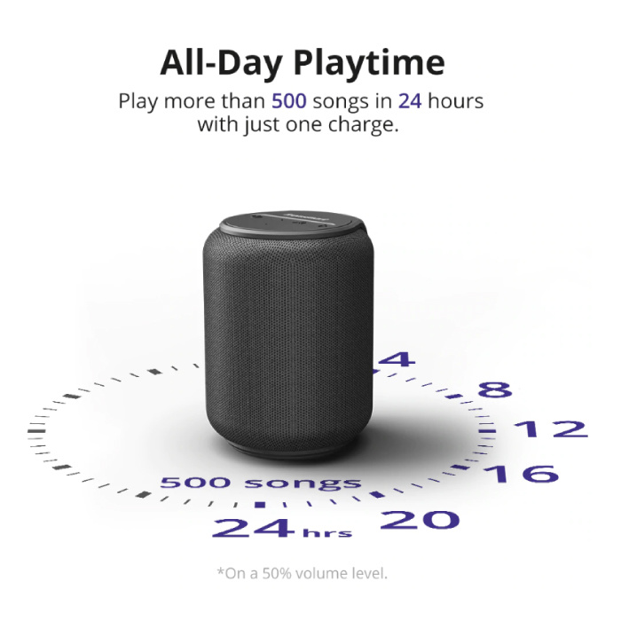 El altavoz tiene una batería de litio recargable de 2500 mAh que le brinda un tiempo de reproducción de 10 horas. Gracias al altavoz estéreo de 15 W, obtienes graves bajos y tonos claros.