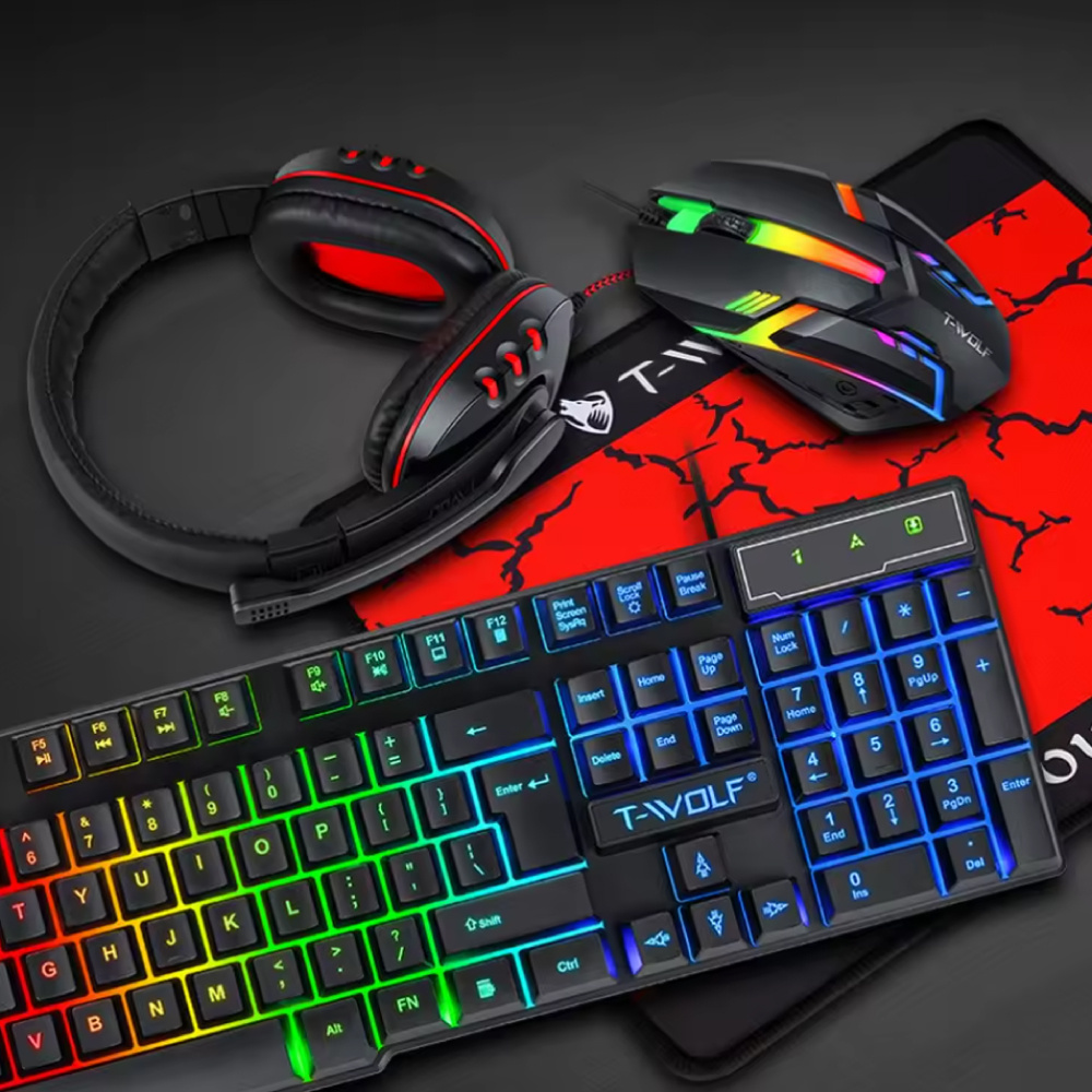 Este set 4 en 1 es la combinación ideal de dispositivos para gamers con presupuesto limitado. Consta de cuatro piezas : un teclado, auriculares con micrófono, un ratón y una alfombrilla. Cada pieza cuenta con una hermosa iluminación RGB personalizable, lo que te permite adaptarlo a tu estilo personal.