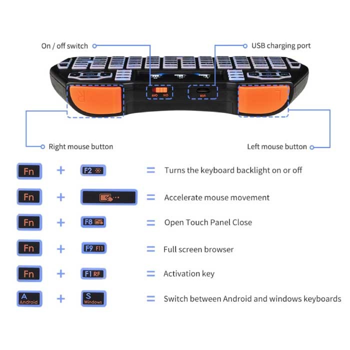 El teclado inalámbrico i8X Plus es fácil de usar en muchos dispositivos. Funciona como teclado, ratón y mando a distancia multimedia al mismo tiempo . El teclado tiene una luz de fondo con un color que puede elegir, por lo que también puede operar el teclado en la oscuridad.
