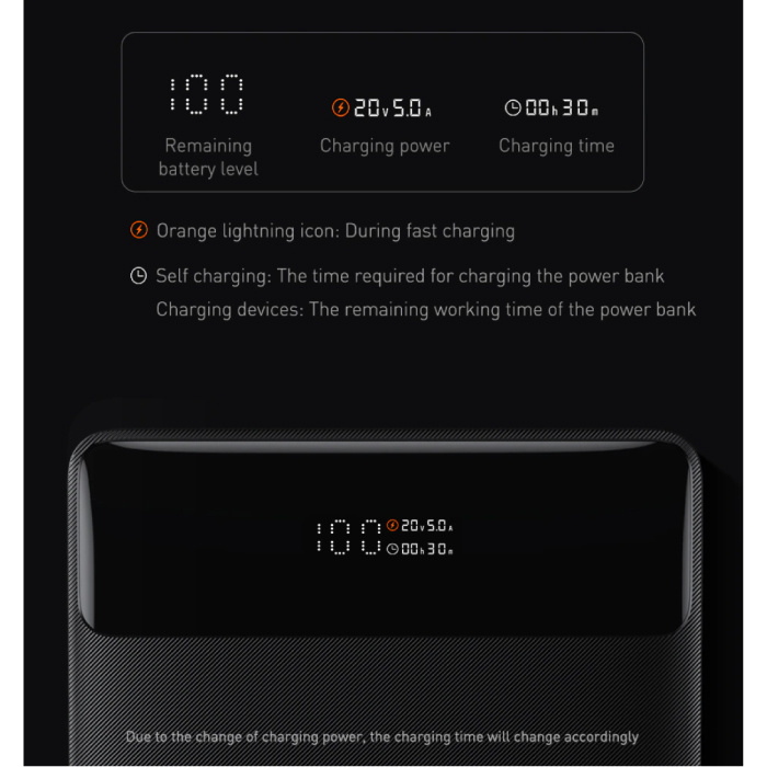 Grâce à la capacité de la batterie de 20 000 mAh, la batterie externe dure longtemps, vous avez toujours une dizaine de recharges complètes de votre iPhone ou smartphone dans votre poche. Sur l'écran LED, vous pouvez voir la charge actuelle de la batterie.