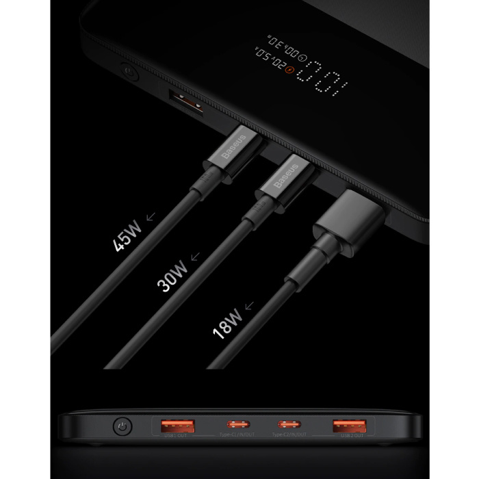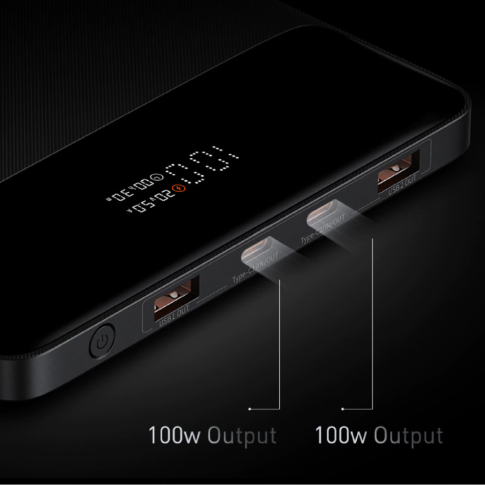 Il est possible de charger quatre appareils simultanément grâce aux 2 ports de sortie et aux 2 ports d'entrée/sortie ; deux ports de charge USB 30 W et deux ports de charge USB-C 100 W (PD). La banque d'alimentation peut être chargée via les deux ports d'entrée/sortie USB-C avec 65 W et peut être complètement chargée en seulement 90 minutes.
