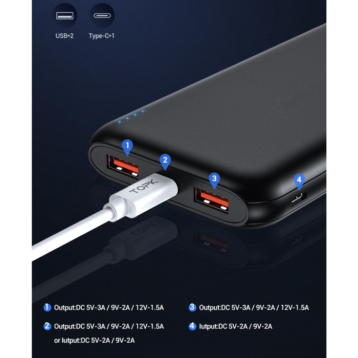 | Sortir: | 1x USB-C 5V-3A/9V-2A/12V-1.5A 2x USB 5V-3A/9V-2A/12V-1.5A |
