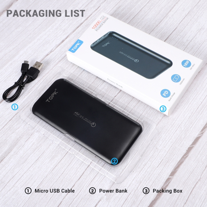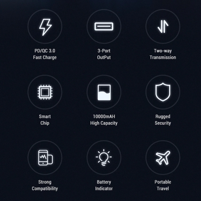 | Le paquet contient : | 1x banque d'alimentation 10 000 mAh 1x câble USB vers USB-C |