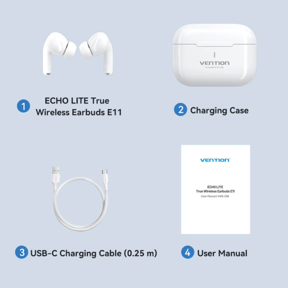 | Le forfait comprend : | 1x écouteurs sans fil Vention Echo Lite E11 1x Station de charge 1x Manuel d'utilisation |