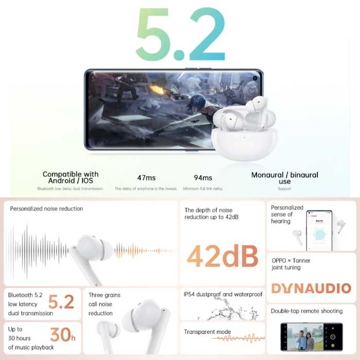 Les écouteurs sans fil OPPO Enco Free 2 utilisent Bluetooth 5.2 pour des vitesses de transmission très élevées. Les oreillettes ont la forme parfaite pour chaque oreille, elles ont été conçues avec un souci d'ergonomie.