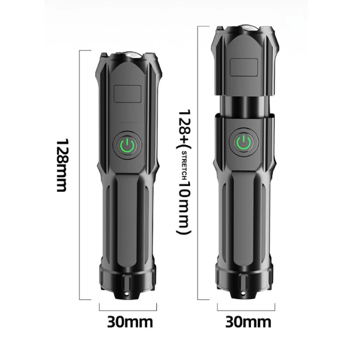 Compacte et rétractable : avec seulement 128 cm de longueur, cette lampe de poche est extrêmement compacte et facile à transporter, parfaite pour les voyages, le camping ou tout simplement pour un usage quotidien.