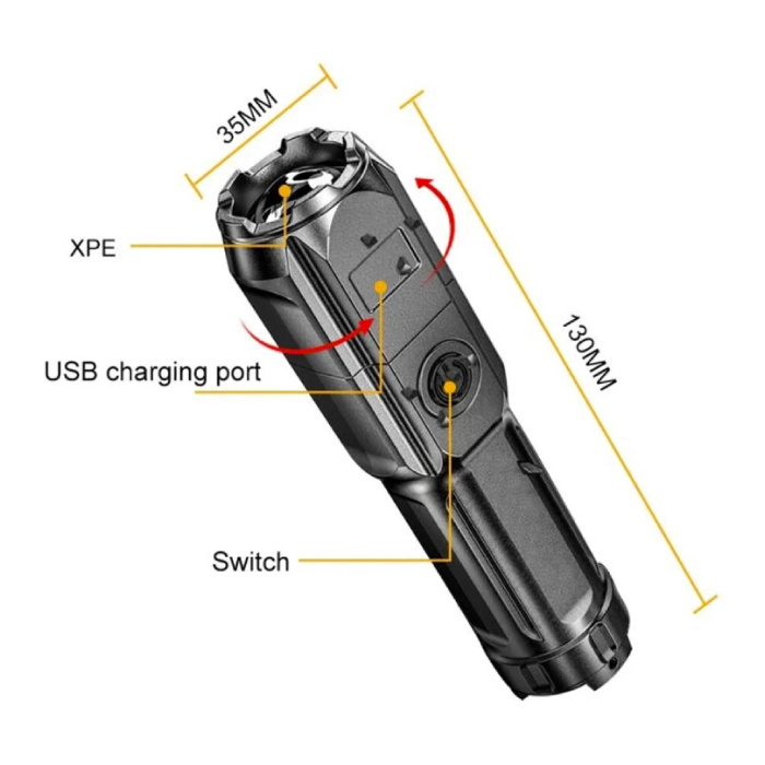 Rechargeable par USB : la recharge USB vous permet de charger facilement cette lampe de poche à l'aide d'un câble USB, apportant commodité et respect de l'environnement.