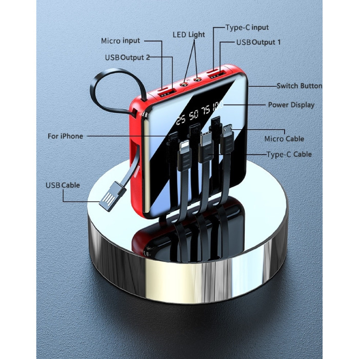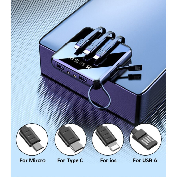 Grâce à sa conception universelle, la batterie externe est facilement compatible avec tous vos appareils, il existe donc un câble de charge pour chaque type de connexion : 8 broches pour iPhone Lightning, USB-C, Micro-USB. Vous pouvez charger la banque d'alimentation elle-même à l'aide du câble de chargement USB intégré.