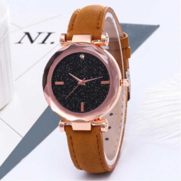 Féminité, élégance et minimalisme, c'est ce que dégage cette montre. La belle montre représente un ciel étoilé et le boîtier de la montre est fini avec des rainures en forme d'étoile. Le contraste entre les aiguilles et le cadran crée une belle apparence.