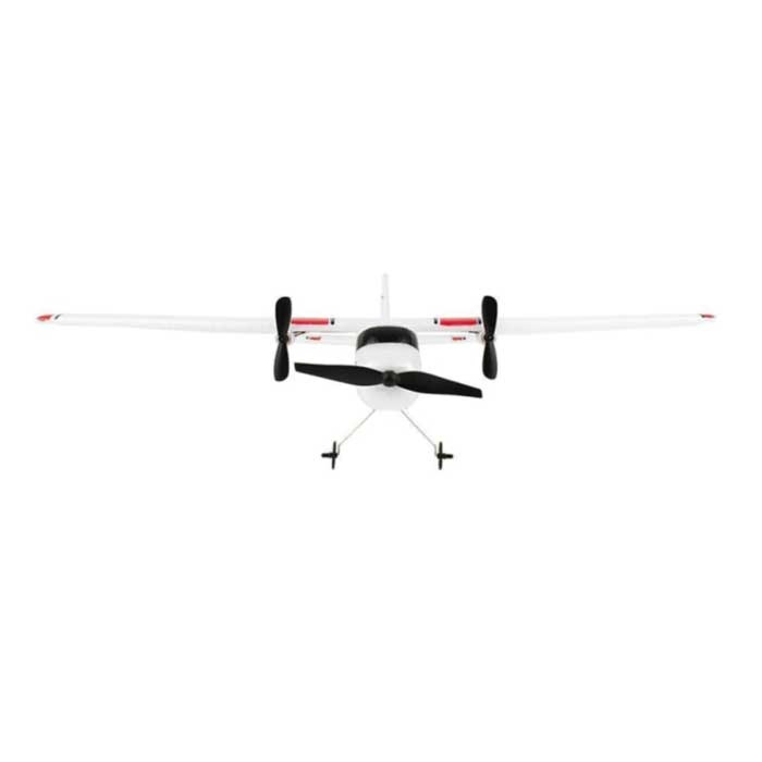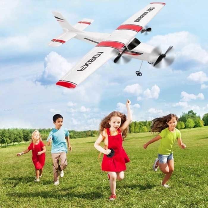 Ce planeur RC est idéal pour les débutants. Lancez l'avion dans les airs et accélérez sur la télécommande pour commencer à voler. Avec le bimoteur, l'avion peut voler jusqu'à 80 mètres dans les airs ! À l'avant, il y a un train d'atterrissage avec des roues en bas.