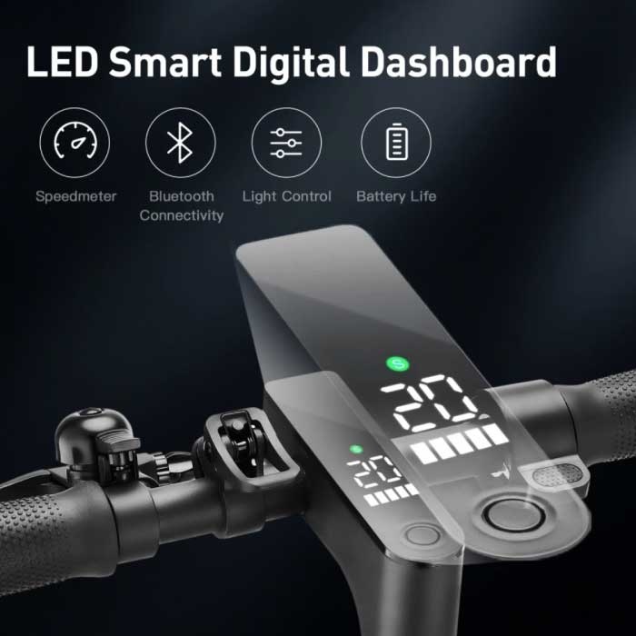 Incidemment, il y a une cloche sur le volant et un panneau de commande LED moderne avec tout ce dont vous avez besoin, y compris la vitesse et le compteur de batterie. Vous pouvez connecter le scooter avec l' application iScooter sur votre téléphone et tout configurer facilement.