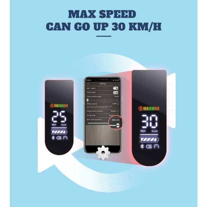 Incidemment, il y a une cloche sur le volant et un panneau de commande LED moderne avec tout ce dont vous avez besoin, y compris la vitesse et le compteur de batterie. Vous pouvez connecter le scooter avec l'application iScooter sur votre téléphone et tout configurer facilement.