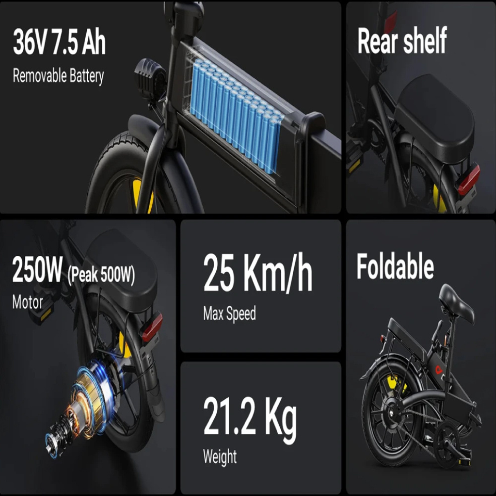 Dotata di un potente motore da 250 W (potenza massima di picco 350 W) e di una batteria da 36 V 7,5 Ah a lunga durata , questa e-bike offre potenza sufficiente e un'autonomia impressionante. Gli pneumatici da 16 pollici garantiscono una guida confortevole e stabile.