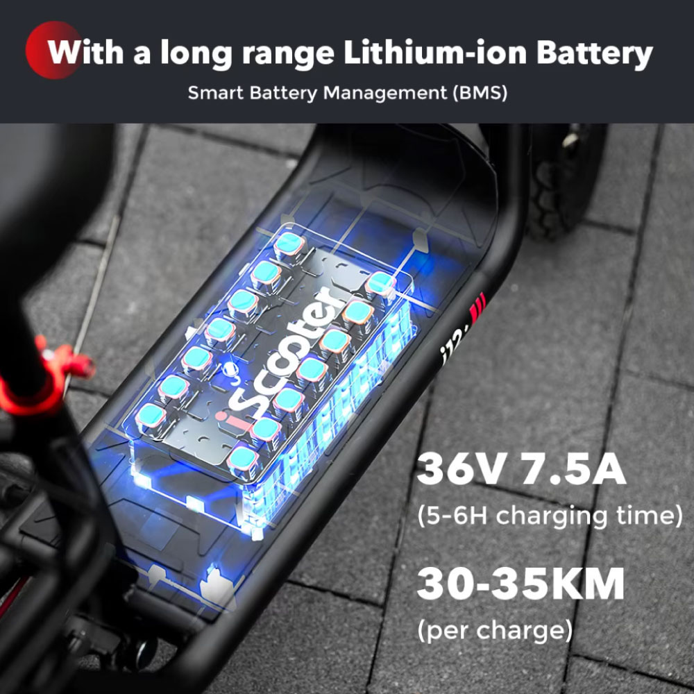 L'iScooter i12 è dotato di un motore posteriore da 500 W che offre prestazioni potenti e un'accelerazione rapida e fluida. Con una velocità massima di circa 30 km/h, puoi facilmente spostarti in città o su lunghe distanze. L' acceleratore a pollice rende l'accelerazione facile e intuitiva, senza dover cambiare marcia.
