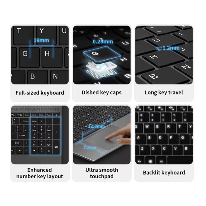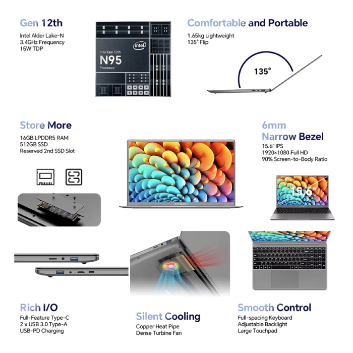 Prestazioni: dotato di 16 GB di RAM LPDDR5 e un SSD da 512 GB , l'F16 Pro offre velocità e funzionalità multitasking senza precedenti. La CPU Intel Alder Lake-N di 12a generazione con una velocità di clock fino a 3,4 GHz garantisce prestazioni fluide anche con attività intense.