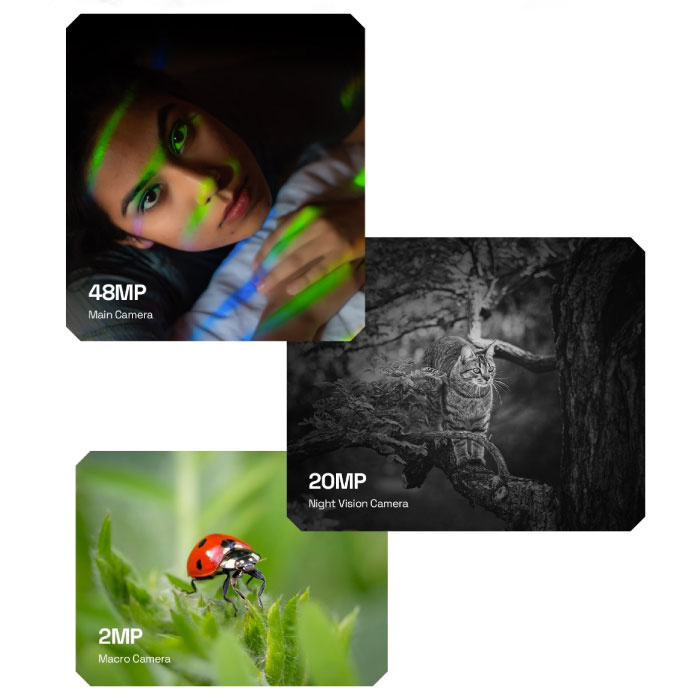 La fotocamera principale sul retro ha una risoluzione di 48 megapixel che è supportata da una seconda fotocamera da 20 megapixel per scatti in visione notturna e la terza fotocamera (2 megapixel) è un obiettivo macro.