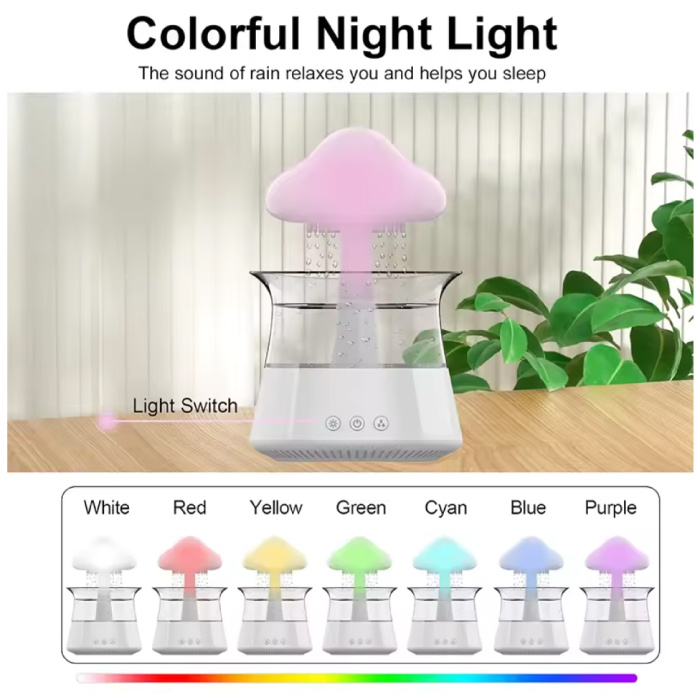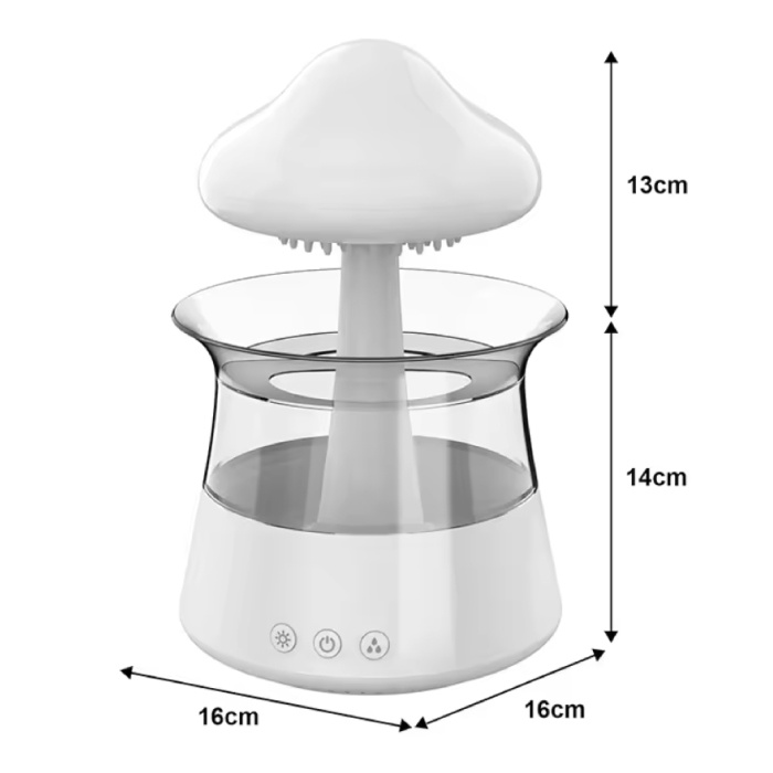 Porta pace e atmosfera nel tuo spazio con l' umidificatore Rain Cloud ! Questo esclusivo umidificatore combina aromaterapia, luci soffuse e suoni rilassanti di pioggia e nebbia in un unico elegante design.