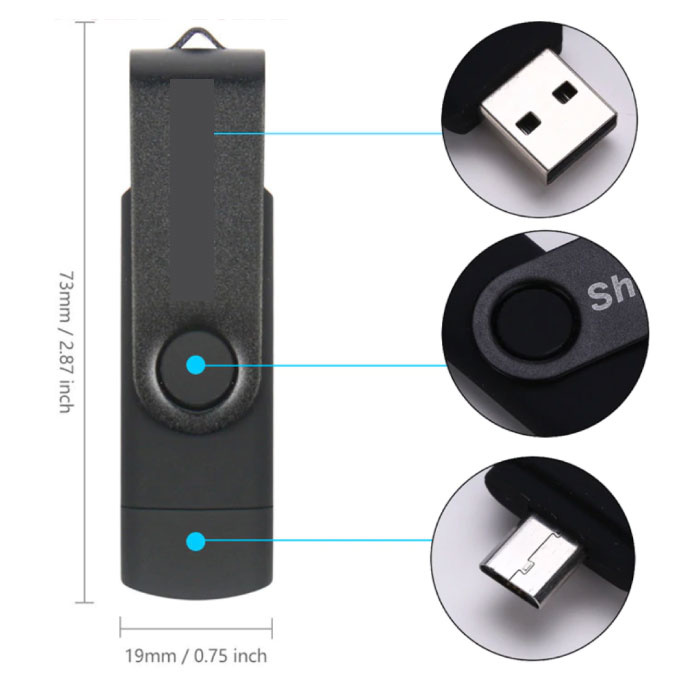 L'unità flash ad alta velocità di ShanDian ha due connessioni; una connessione USB 2.0 standard ma anche una connessione USB-C per un trasferimento veloce e compatibilità con altri dispositivi come il tuo smartphone.