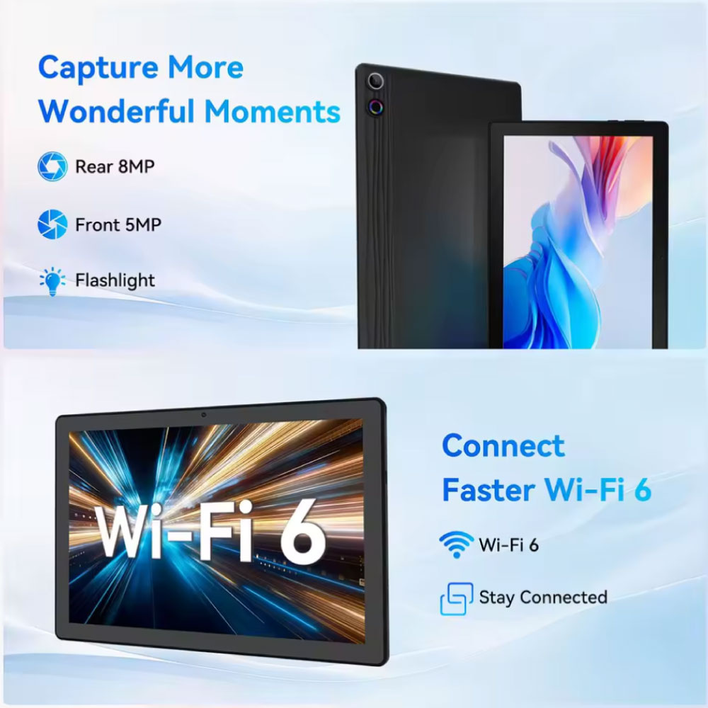 De tablet ondersteunt WiFi 6 voor stabiele en snelle internetverbindingen, zelfs in drukke netwerken. Met Bluetooth 5.3 koppel je eenvoudig je accessoires. De dubbele speakers zorgen voor een aangename audioweergave, terwijl de 5MP frontcamera en 8MP achtercamera perfect zijn voor videogesprekken, online lessen en foto’s.