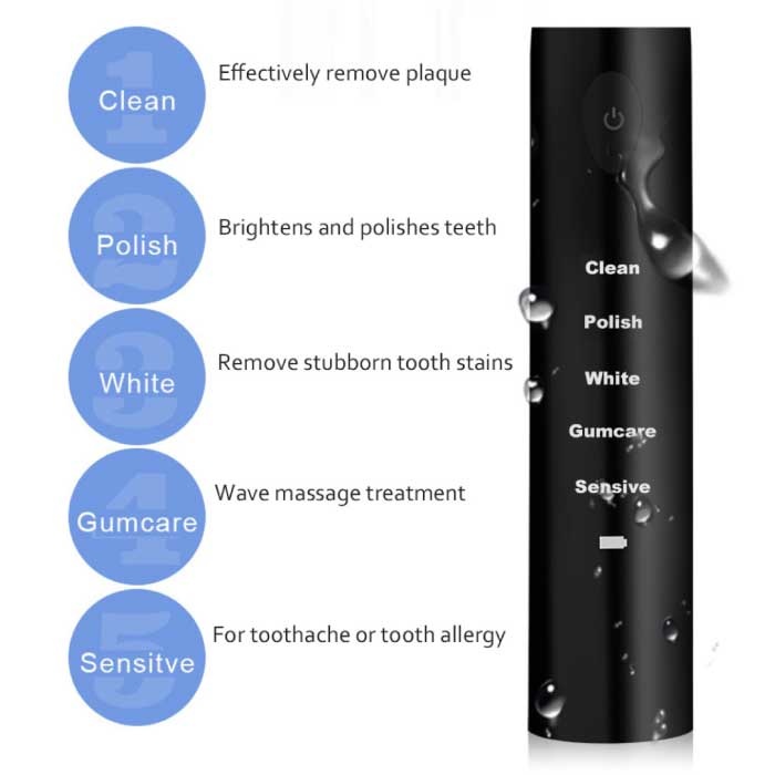 De aan / uitknop op de elektrische tandenborstel kan worden gebruikt om te schakelen tussen de vijf verschillende standen. Je kan de borstelmodus kiezen die het beste past bij je dagelijkse behoefte.