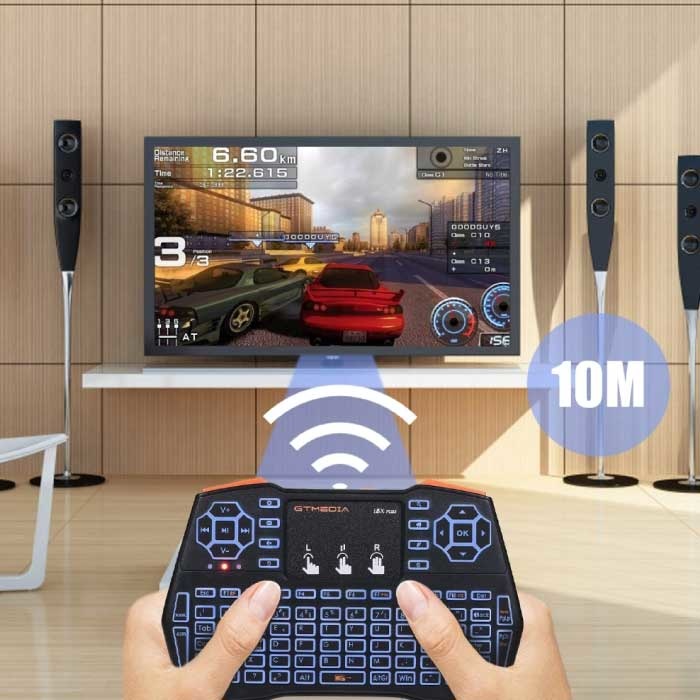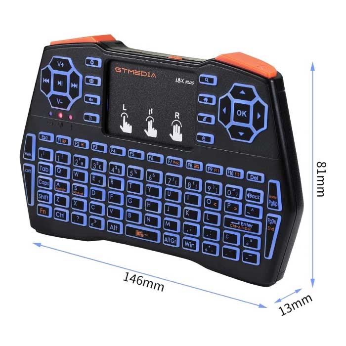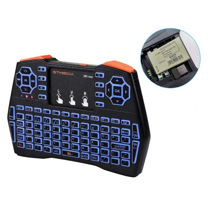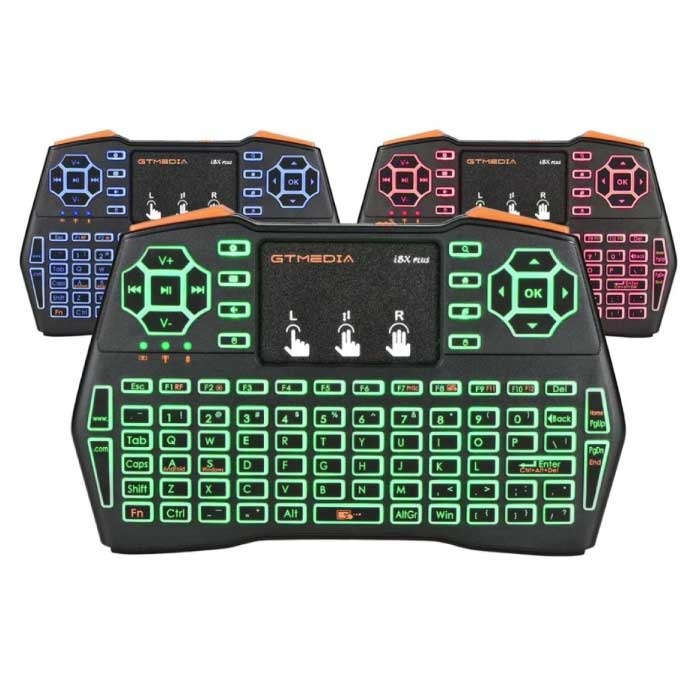 Het i8X Plus draadloos toetsenbord is makkelijk om te gebruiken op tal van apparaten. Het functioneert als toetsenbord, muis en multimedia afstandsbediening tegelijkertijd. Het toetsenbord heeft een backlight met een kleur die u kan kiezen, zo kan u ook in de donker nog het toetsenbord bedienen.