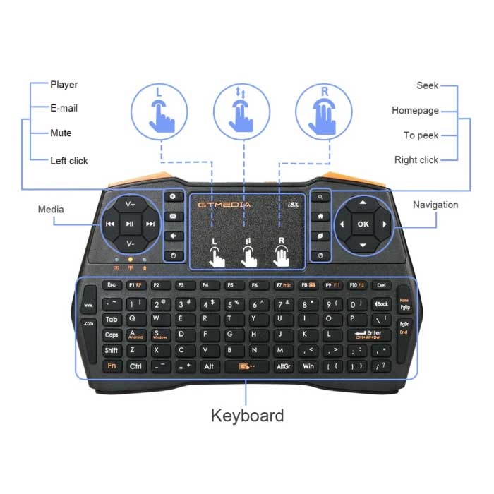 Buiten de gewoonlijke knoppen zijn er diverse extra functies te vinden. Zo is er een touchpad dat u als muis kan gebruiken, multimedia knoppen en zelfs twee triggers die u gebruikt als linkse en rechtse muisklik. U kan de afstandsbediening tot 10 meter ver gebruiken zonder signaalstoringen.