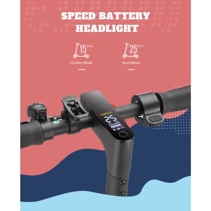 Overigens staat er op het stuur een belletje en een modern LED bedieningspaneel met alles wat je nodig hebt inclusief snelheids-en batterijmeter. Je kan de scooter koppelen met de iScooter app op je telefoon en zo alles eenvoudig instellen.