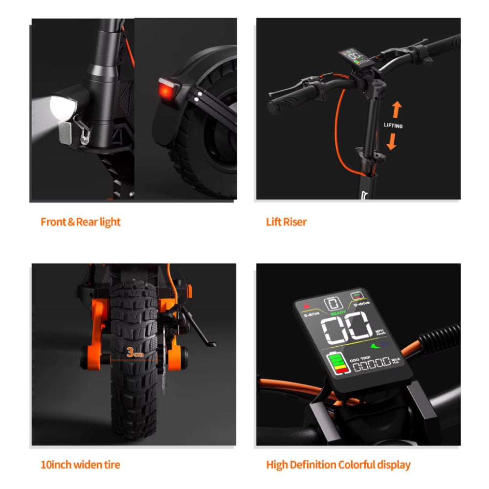 De scooter is uitgerust met 10 inch brede off-road banden, die extra stabiliteit en grip bieden op verschillende ondergronden. In combinatie met het rocker arm high-elasticity veringssysteem ervaar je een uitzonderlijk comfortabele rit, zelfs op oneffen wegen.