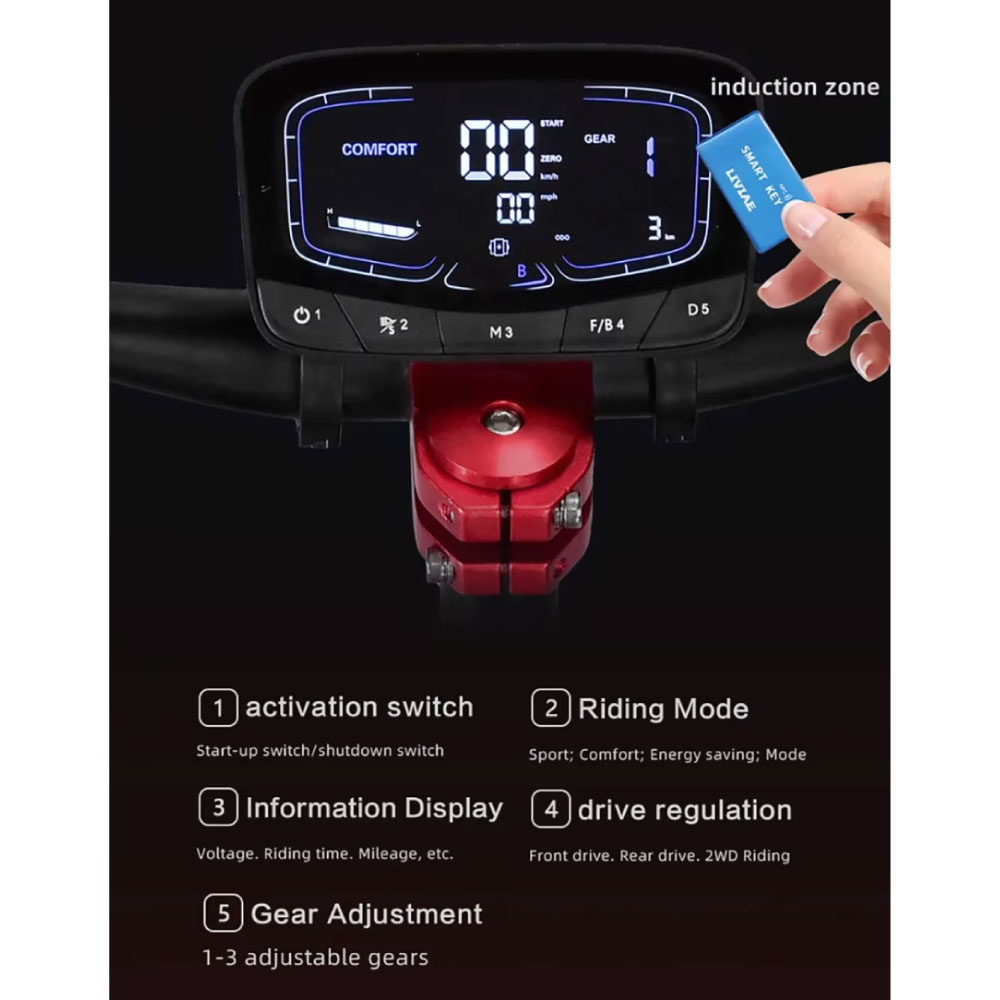 De krachtige 38Ah batterij zorgt voor een uitstekende actieradius tot 120 km op één lading. Hierdoor kun je lange afstanden afleggen zonder je zorgen te maken over tussentijds opladen. Dankzij de krachtige motor en het robuuste ontwerp kan de scooter hellingen tot 45° aan, wat hem geschikt maakt voor uiteenlopende terreinen.