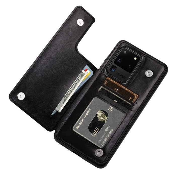 Het leren hoesje combineert uw portefeuille en smartphone in één omhulsel; er is ruimte voor creditcards en contant geld op de achterkant en in de afdekklep van het hoesje.